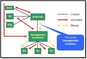 Figure 1; Procurement structure – Management contracting (source: Lecture notes, University of Reading, 2014)