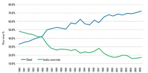The results further show that the use of steel in the construction industry has seen continues growth over the last few decades, in comparison with the concrete. This comparison was completed considering the choice of material adopted by the user for the frames in the multi storey buildings. This could be due to the factors which have been previously described in this case study, strengthening the argument that industry is adapting to more efficient and economical methods of construction.