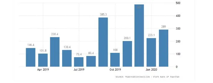 The statistics show that the country Pakistan has an average of 162.51 USD billion and reached 1262.90 USD Million in June of 2008. However, the country has also faced a low record of -367.50 USD Million in October of 2018.