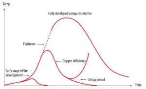 The point when the material in the compartment has been on fire for a long while, the loss rate of mass and fuel and thus, the discharge rate of heat diminishes. Assuming that there are just leakages in a compartment, which is generally shut, it can be seen that the fire does not advance to a flashover because of the absence of oxygen. The intensity of the fire lessens before there is a flashover.