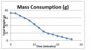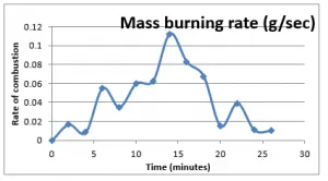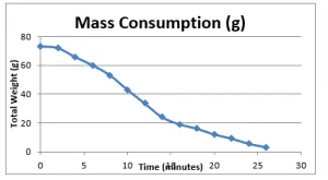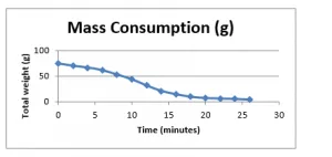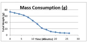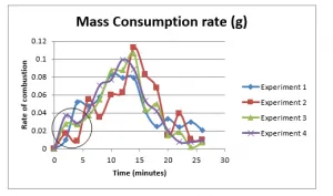 As it can be clearly seen from the figure above, after 2 minutes of interval, the rate of mass consumption is; experiment-4 > experiment-3 > experiment-2 > experiment-1, which is a clear evidence of the effect of the air/wind on the fire. It further shows the experiment 4 has most consistent changes in mass consumption rates, with much less deviations as compared to the rest of experiments, which is due to enhanced mixing of reactants. The calculated rate of combustion is least for the experiment 1, which is evidently due the lack of supply of air/wind.