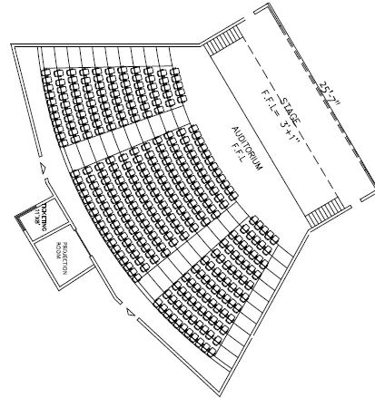 The auditorium or ceremony halls are usually designed to serve a single function with fixed seating, inclined floor and writing furniture. An unobstructed and clear view is required for each seat to the stage or the presentation wall. For best visual communication the structure is required to be well equipped.