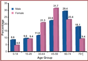 The most recent Saudi Cancer Registry (SCR) reports on cancer prevalence and rates indicate that the total number of reported cases was 13,706 in 2010 (Saudi Cancer Registry 2010). This rate is relatively evenly divided in terms of gender, with 48% of those affected being male (6,579 cases) and 52% being female (7,127 cases). Men were found to have an increased rate (up to 1.5 times the normal rate) of cancer after the age of 64, and the median ages of sufferers were calculated to be 51years for women and 58 years for men. The report also disclosed a geographical division, with Riyadh (central), Tabuk (northwest), Makkah and the Eastern Province having the highest rates, which were measured as 115.00, 92.00, 77.00 and 116.00 (all per 100,000), respectively in 2010 (Saudi Cancer Registry 2010). Further information from the Saudi Cancer Registry’s 2010 report is shown in the figure presented in Appendix 1.