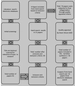 The narrative approach to the synthesis of research evidence involves critical appraisal of large bodies of evidence, which can employ different research designs, including qualitative and/or quantitative, or a combination of both - mixed methods. The narrative approach is particularly relevant to synthesise diverse evidence from a range of study designs, as is the case here. It is noteworthy that, unlike the commonly used specialist synthesis methods, narrative synthesis has not been well developed. For example, one particular weakness of narrative synthesis mentioned in the literature is the lack of transparency (Dixon-Woods et al. 2005) and the lack of clarity on methods and guidance on how to conduct such a synthesis (Mays et al. 2005).