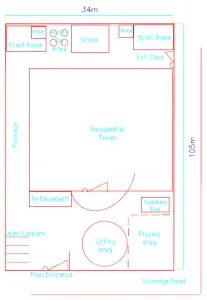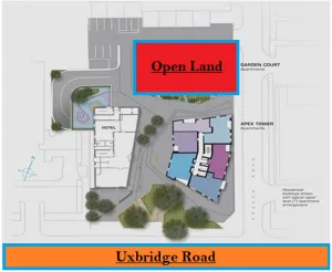 The entrance of the site has been proposed to be boulevard frontage, from the Uxbridge Road. The underground car park and the Open visiting car park, both are provided such as to provide easy access from the site entrance. The swimming pools, playing area and the sitting areas are provided close together so that the families could use all these facilities without having to walk long ways. The main store, waste collection, supplies and the control/plant room has been provided at the back of the Tower structure, as public access is not required in these areas. An emergency exit has also been provided at the back of the tower in order to meet the safety and security standards