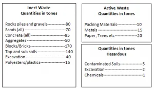 The waste types such as concrete, tarmac, bricks, blocks/piles etc. will be reused on site where possible. If not required, the materials will be sent/sold to vendors in the form of re-usable materials. Materials such as metals and plasterboards will be sent for recycling off-site. All the construction materials which will not be used or saved through the re-use policy of materials will be sent to other projects. Some of the materials might as well be saved in the store for future use (such as tiles/paints etc)