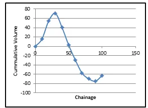 Plotting the cumulative volume against the chainage gives the Mass Haul Diagram;
