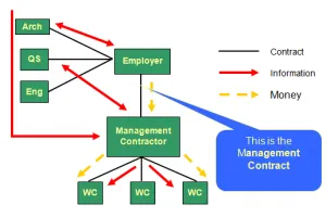 Figure 1: Procurement structure – Management contracting (source: Lecture notes, University of Reading, 2014)