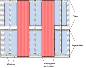 The proposed vertical section of the building is composed of main building ducts along with the window panels, as shown in the figure above. This design would enable the developer to utilize these large ducts for any service requirements in the future. In this design, these passage ways will be used to install services lines required for electric power cables, hot and cold water supply, drain lines, and as means of providing ventilation.