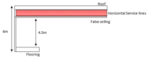 The Horizontal distributions of services are designed to expand through the top of roof ceiling, to be installed on roof walls. Approximately 1 meter of width has been provided for easy installations and access, as shown in the figure below. This space shall be sufficient to provide the complete air control system ducting throughout the floor(s). The detailed diagrams of the proposals are presented below in the Figure-5 and Figure-6