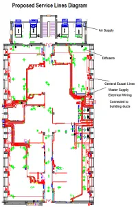 The figure below illustrates the horizontal hot and cold water service lines, HVAC ducts and lines, diffusers and exhaust facility. Along these lines, Stainless steel cable trays shall also be installed for electric lightings and other electric installations