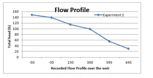 The flow profile in the Experiment 1, where the gauge head was set at 90 mm, showed that discharge over the weir is not very steep, the flow/discharge starts to settle at the critical depth (yc) of 225 mm (59.4 + 165 mm). This is because of lower flow rate and a lower upstream gauge head (h).