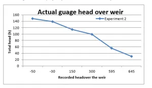 The same results are also plotted in terms of the actual gauge head over the weir, via subtracting weir height (p) of 165 mm from the total head, producing the following graph;