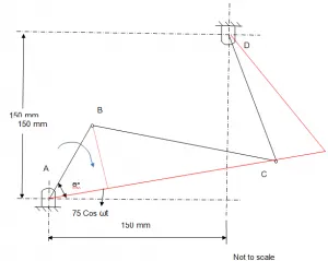 Assuming that the crank AB is at the furthest at Θo = t, with displacement of AB + BC = 275mm. Taking this as the reference point, the Position Vector Equation can be derived as;