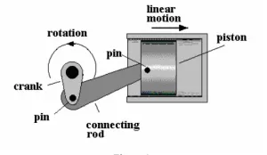 Example of such mechanism can be found in assembly of a crank connecting with rods and piston. Tuning of the crank produces an angular movement that is transformed into a linear motion, as shown in the drawing below;