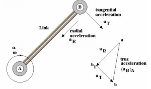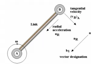 As shown in the figure below, the acceleration of B, moving perpendicularly to the link, is circular. The true acceleration can be obtained using the relationship given below.