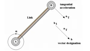 When the link possesses an angular acceleration α R/s2 then the resulting acceleration can be termed as the tangential acceleration. The concept of tangential acceleration can be explained by considering the example of a link AB with an angular acceleration about A.