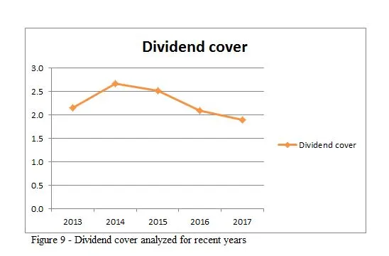 An erratic yet overall positive trend is observed upon comparing the owners' equity ratio, as illustrated in Figure 7. Similarly, in the case of earnings per share, the trend remains positive, as depicted in Figure 8. The dividend yield exhibited an upward trajectory over recent years, whereas the dividend cover shows a declining trend.