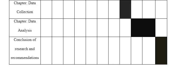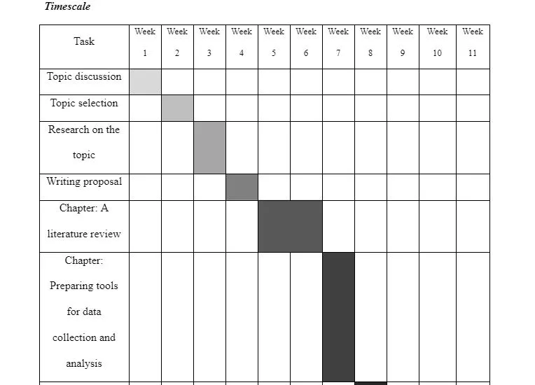 The timeline is structured into nine phases. In the initial phase, the topic selection is completed during week 1. Subsequently, the second phase, which entails refining and finalizing the chosen topic, occurs in week 2. Weeks 3 and 4 are dedicated to researching the selected subject and drafting a comprehensive proposal. The subsequent weeks, 5 and 6, are designated for developing the literature review chapter. Moving forward, week 7 focuses on the critical stages of data collection and analysis. The data collection phase is executed in week 8, followed by an intensive data analysis process spanning weeks 9 and 10. The final phase involves crafting the conclusion, which is accomplished in week 10.