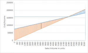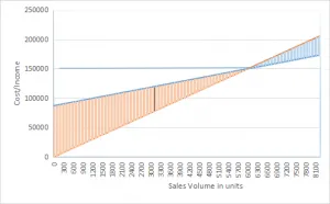 Similarly, the Machine B sell the products for £25 per product, with variable cost per product produced is £10.50, and total fixed costs of £87,000. The break-even graphs (Costs/Income -v- No of Products) for Machine B can be produced as;