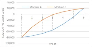(a)(i): For machine A, cumulative cash flow can be determined as;