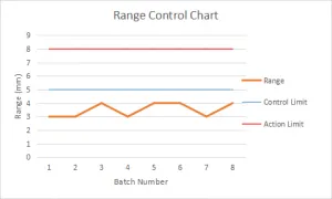 However, the range control charts shows that all the batches produced are within the defined range of diameters, as the pipe sized do not exceed that the control limit (5mm) and the action limit (8mm) within a batch. This shows that production of pipes in in a batch are in accordance with the set/target range parameters, but this does not implicate that the sizes are in accordance with the drawing specifications.