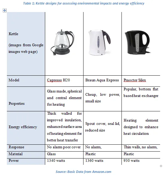 Many kettles are now available in the market that offers smart and sustainable design options. Through reliable and durable kettle designs have been selected to assess their environmental impacts and energy consumption/efficiency functions, a summary of which is shown in Table 1 below;