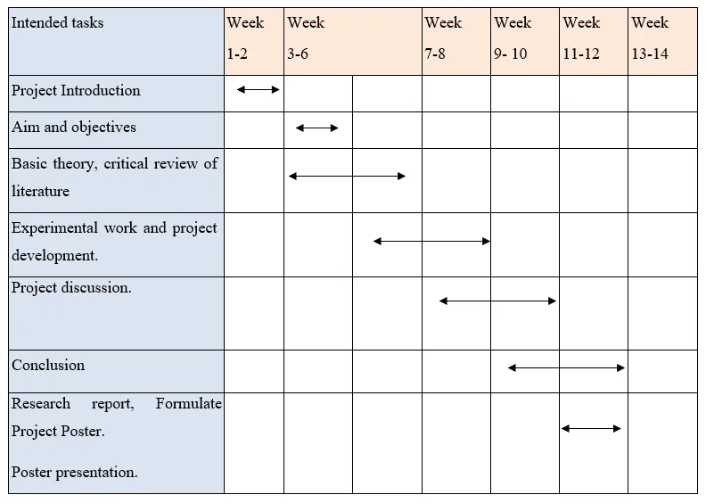 The final project report will be completed and submitted in the final phase of this research. The report will include the project introduction, aims and objectives, basic theory, critical review of literature, experimental work completed, developments, discussions and conclusions. The project poster will also be formulated and presented in this phase of the project. The Project Gantt Chart for this project has been outline as below;