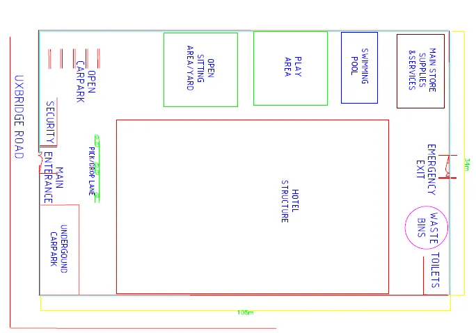 The site chosen for the construction of the project is centrally located and the schemes presented blend with the purpose of the hotel. The site is located north of Uxbridge in the Ealing Town Center. The site front’s onto the main Uxbridge Road – A4020, and borders along the rear Craven Avenue residential property. The total site area is estimated to be 3346 m2, which is 34 m long from the front and 105 m in long depth.
