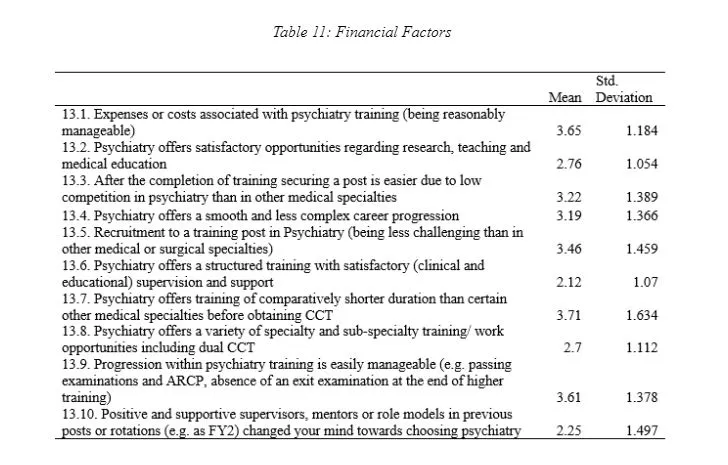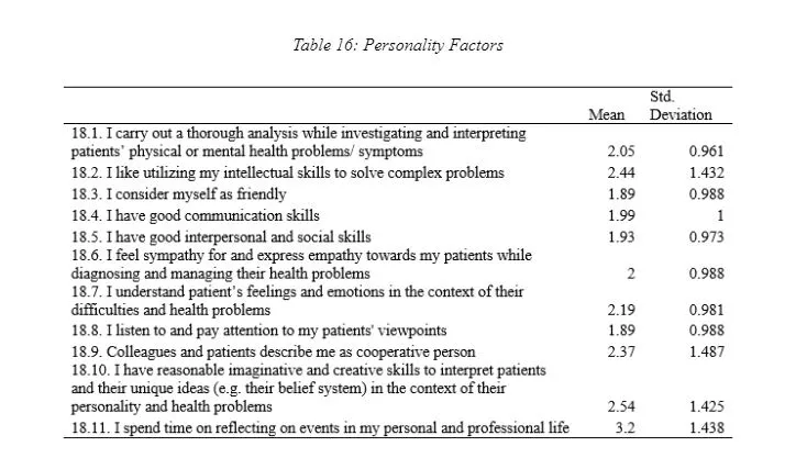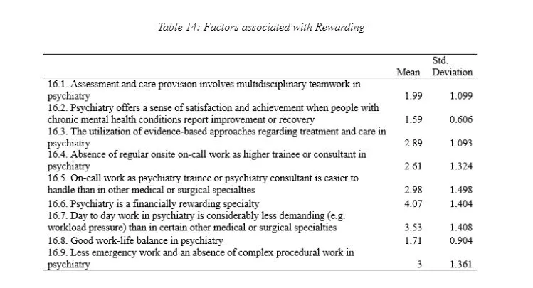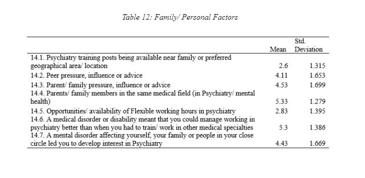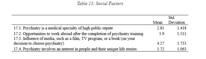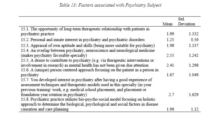Table 13 illustrates that most of the responses are near 2, indicating that they are quite important. The standard deviation is minimal, even in the case of factors associated with psychiatry as a medical speciality.