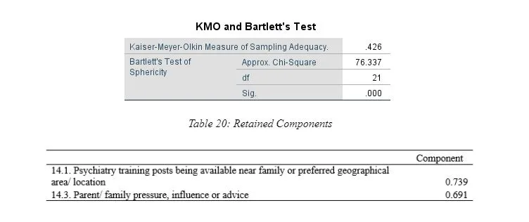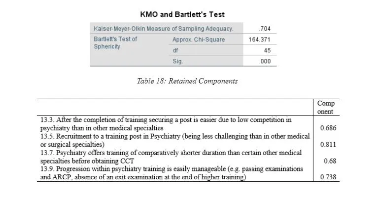 Moreover, the sampling adequacy is computed as moderately accurate as the value is 0.704. Concerning Table 18, it has been found that four factors are retained. These factors include securing a post after completion of training, recruitment to a training post, shorter duration of training in psychiatry than other medical fields, and the easily manageable aspect of psychiatry.