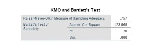 The results of the personality factors have been presented in Tables 27 and 28 of KMO and Bartlett's test and component matrix, respectively. The KMO and Bartlett's table shows that the sample is adequate because the asymptotic significance is below 5% (0.05) (p-value= 0.000< 0.05). Hence, the sampling adequacy can be recognized with this. In furtherance, the sampling adequacy is computed to be highly accurate as the value is 0.865 and is approaching 1.