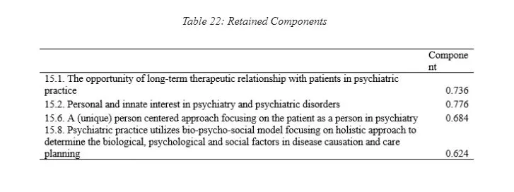 Further, the sampling adequacy is computed as moderately accurate as the value is 0.757. According to Table 22, it has been found that four factors are retained. The retained factors include opportunity in psychiatry, personal interest, a person-centred approach, and an approach to determine the disease based on the bio-psycho-social model.