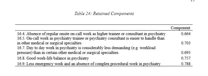 According to Table 24, it has been found that five factors are retained. The retained factors include the absence of regular on-site calls, on-call work in psychiatry being easy to handle compared to other medical fields, less work pressure, more work-life balance, and less complex work leading to fewer emergency cases than other medical fields.