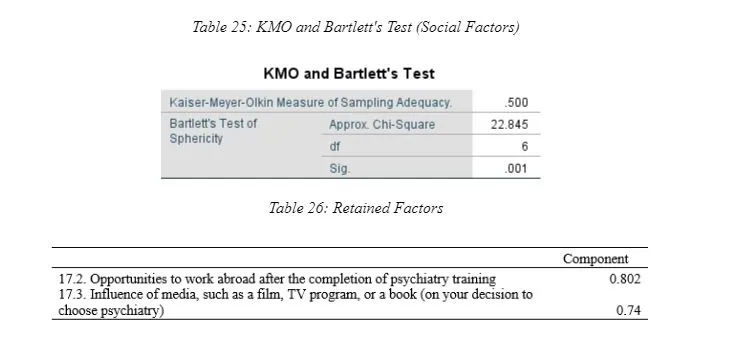 Besides, the sampling adequacy is moderate as the value is 0.500. In Table 26, it has been found that only two factors are retained. The retained factors include opportunities to work abroad following the completion of training. Another factor is the influence of external factors like media, television, and books that affect the decision to opt for psychiatry in the future.