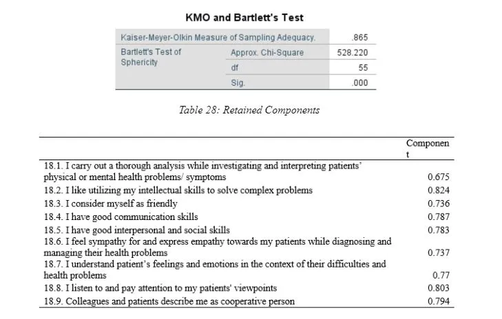 According to Table 28, it has been found that nine factors are retained. The retained factors include specific analysis skills to investigate a patient, interest in solving complex problems with intellectual skills, friendly nature, and good communication skills. Some other factors include good social and interpersonal skills, sentiments of sympathy and empathy, comprehension of emotion, attentive listening, and cooperative nature.