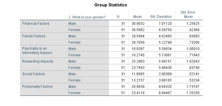 To evaluate the differences in perception based on Gender and interest in choosing psychiatry as a medical speciality, an independent sample t-test has been used.
