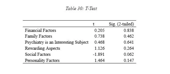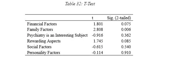 In this case, the participants who chose psychiatry as a medical speciality in the foundation year are compared with the ones who have not had this opportunity. The results have been presented in Table 31 and Table 32. It has been found that the perception of family factors significantly differs based on placement. Group statistics revealed that those not placed in the foundation year prefer family factors to be more critical (p-value= 0.006< 0.05).