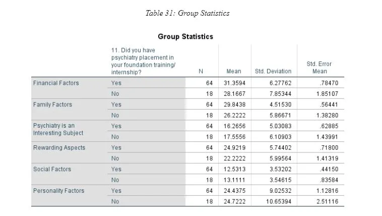In addition, some other factors that can be found having differences in perception if the threshold for significance is 10% are financial factors and rewarding aspects of psychiatry. In both cases, those who have not had the placement in foundation years deem them more important than the ones who have had the placement.