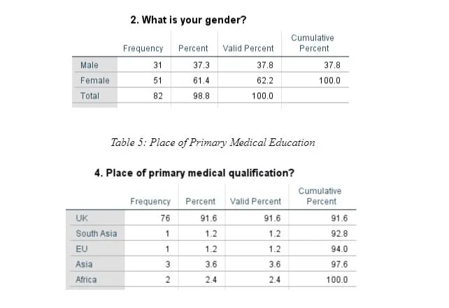 In this section, the general characteristics have been analyzed, for instance, gender, age, place of medical qualification, and others, considering their possibility of affecting the choice of psychiatry as a medical speciality. In Table 3, most respondents fall in the age group ranging from 20 to 34 years, with 53% concentration. Concerning gender, Table 4 illustrates that 62.2% of females participated in this study. Moreover, Table 5 illustrates that 91.6% of the participants acquired their primary medical qualification from the UK, while 3.6% acquired it from Asia. In addition, Table 7 illustrates that 62.7% of the respondents hold MRCP while 37.3% do not.