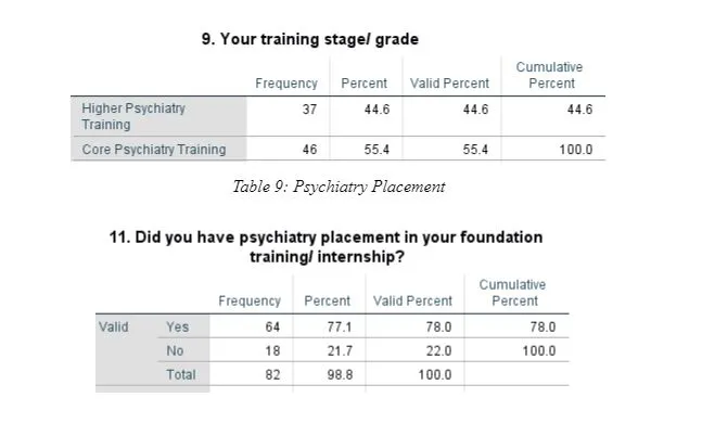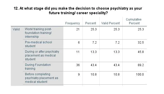 Moreover, according to Table 8, 74.7% of the respondents work full-time. Table 9 depicts that 55.4% are at the core psychiatry training stage. Table 10 shows that 71.7% had psychiatry training in the first foundation year. However, in terms of the decision-making stage, 43.4% decided to opt for psychiatry as a medical speciality in the foundation stage; the results are depicted in Table 11.