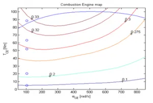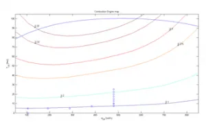 The figure below shows the plot of the resulting speed and torque distribution on the combustion engine map for the same drive cycle;