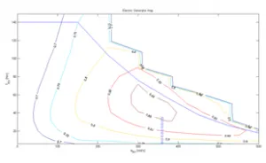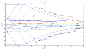 The figure below shows the plot of the resulting speed and torque distribution on the electric generator map for the same drive cycle;
