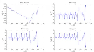 Similarly, the following figures represent the battery charge ratio, battery voltage, battery current and battery power simultaneously concerning time for the same drive cycle;