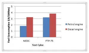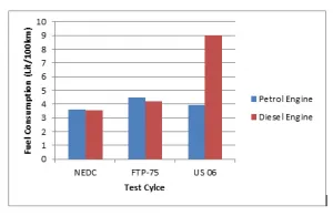 Figure 13 shows that the petrol engine and diesel engine show similar consumption rates for the NEDC test cycle, with a petrol engine fuel consumption rate of 0.062 lit/100km higher than the diesel engine. Similarly, for the FTP-75 test cycle, the petrol engine has a higher consumption rate, with the difference being 0.3069 lit/100km. However, for the US 06 test cycles, the difference between petrol engine and diesel engine consumption rates is quite significant, where the diesel engine consumption rate is 5.0609 lit/100km higher than the petrol engine.