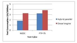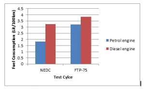 From the figure and the table above, it can be concluded that both the petrol engine and diesel engine fuel consumption rates have improved through hybrid vehicles. For the NEDC test cycle, the diesel engine fuel consumption rate is 0.835 lit/100km higher than the petrol engine. However, for the FTP-75 test cycle, the petrol engine has a higher consumption rate, with the difference being 1.499 lit/100km compared to the diesel engine.