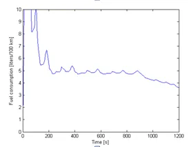 The two Figures above show variations in fuel consumption rates in a form cycle. The pattern was calculated for 600 seconds, and a mean/average value of 9.006 fuel consumption rate per 100 km was calculated for the overall test cycle.