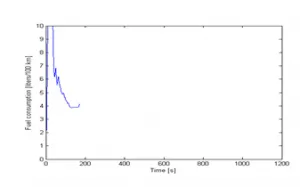 Figures 3 and 4 illustrate that the fuel consumption rate is highest at the start of the engine cycle (time between 0 to 60 seconds), which eventually stabilizes with time. The final fuel consumption rate of 4.1521 per 100 km is reached at the time of 180 seconds approximately.