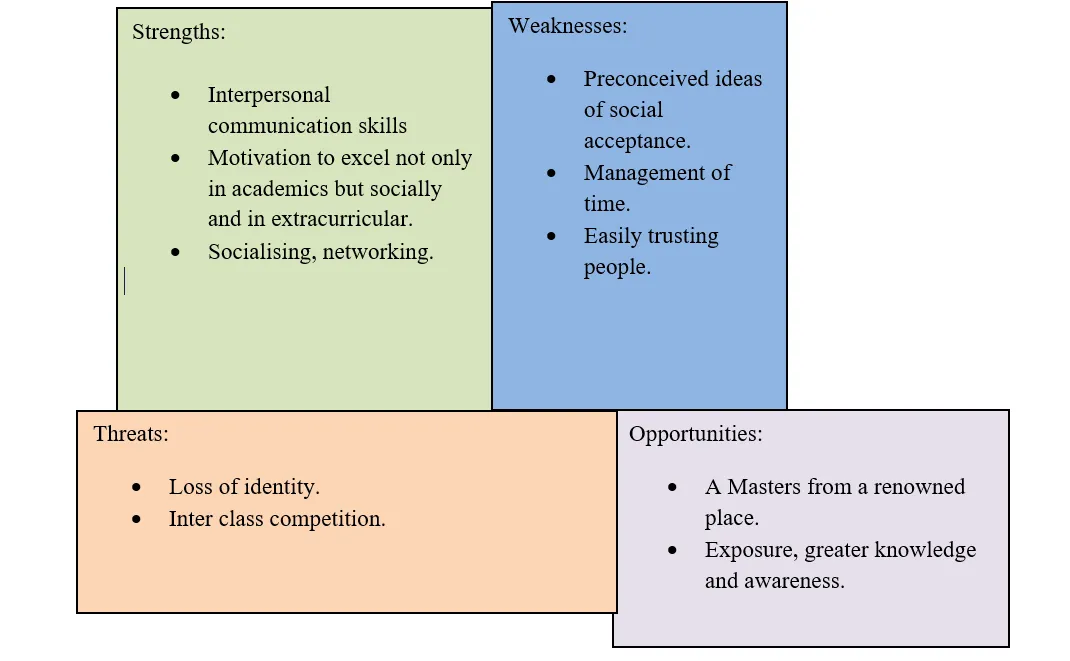 I conducted a SWOT analysis to identify my strengths and weaknesses in response to a new culture and society.
