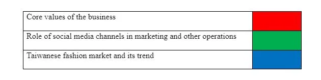 To analyze the aims and objectives of the study, the main areas that are focused on in the study include core values of the business, the role of social media channels for marketing as well as other operations, and the Taiwanese fashion market along with the trends. Different colors are allotted to every theme that is identified in the study. Below are the findings of the study that would help in understanding the way by which online celebrities shape the Taiwanese fashion industry. There were two respondents in the interviews that are Julia and Bonnie. The focused group interview sessions are also being conducted in which there are several respondents were involved.